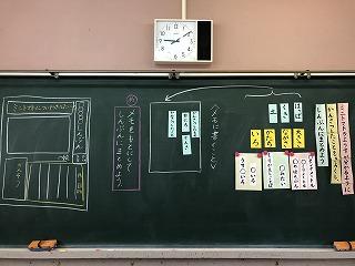 2年生の国語の授業です。「ミニトマトのようすがわかるように、かんさつしたことをきろくし、しんぶんにまとめよう」という目標で授業をしています。今日は「メモをもとにしてしんぶんにまとめよう」というめあてで新聞を書いています。