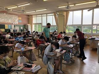 英語専科の北川先生と、ALTのジョシュが6年生の授業を進めています。ファイルを机の上に出した後、「テイクアウト」という指示が出されました。