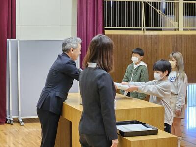 式の冒頭では、各学年の代表児童が誇らしげに修了証書を受け取りました。真摯な表情で証書を受け取る姿は、一年間の成長を力強く物語っていました。