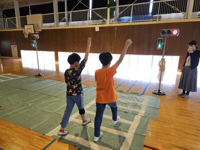 学んだ後は、実際に道路を想定した場所で横断歩道の渡り方を練習しました。