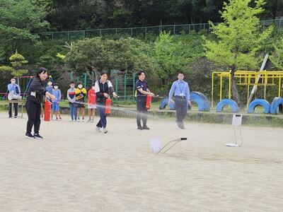 最初は少し緊張していた児童も、消防士さんの指導を受けて、上手に放水することができました。