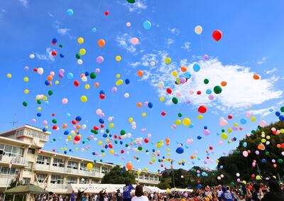 曇り空がその時だけ青空に!子どもたち手から放たれた色とりどりのバルーンが一斉に舞い上がりました。その光景は、練習の成果を出し切った子どもたちの輝く笑顔と、50年の歴史に感謝する思いに美しい彩りを添えるかのようでした 。