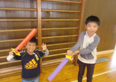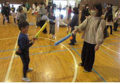 剣ができたら、いよいよチャンバラスタートです。相手の剣についているカラーボールを落とすルールで、チームに分かれてゲームを行いました。